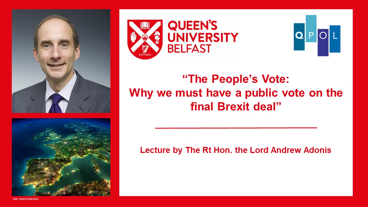 The Rt Hon. the Lord Andrew Adonis will be coming to Queen’s University Belfast on Thursday 19 July to deliver a lecture as part of the Queen’s University QPol Policy Engagement lecture series. The lecture is entitled The People’s Vote: Why we must have a public vote on the final Brexit deal.