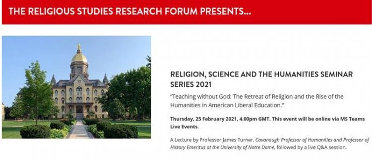 The event is part of the Religion, Science and the Humanities Seminar Series 2021 and will feature keynote lecture from Professor James Turner, Cavanaugh Professor of Humanities Emeritus at the University of Notre Dame, followed by a Q&A session. For more information, and to view the event, please click HERE