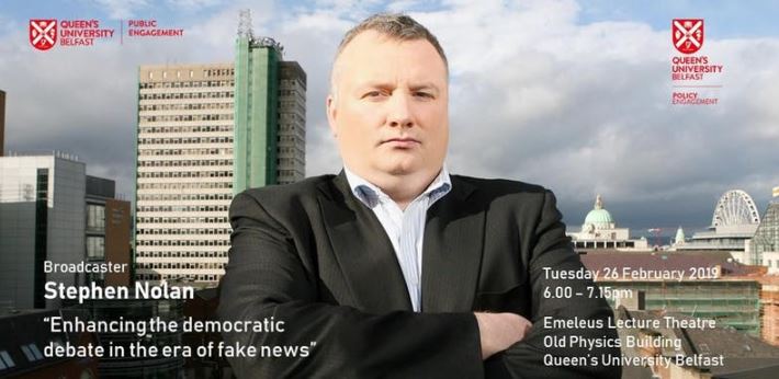Queen’s University Belfast is delighted to welcome Stephen Nolan, radio and television presenter, to deliver a public lecture at the University on 26 February at 6.00pm in the Emeleus Lecture Theatre.